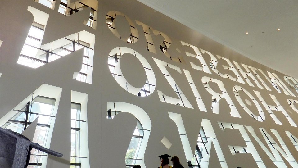 Kit with her degree certificate in the foyer of the Wales Millennium Centre.